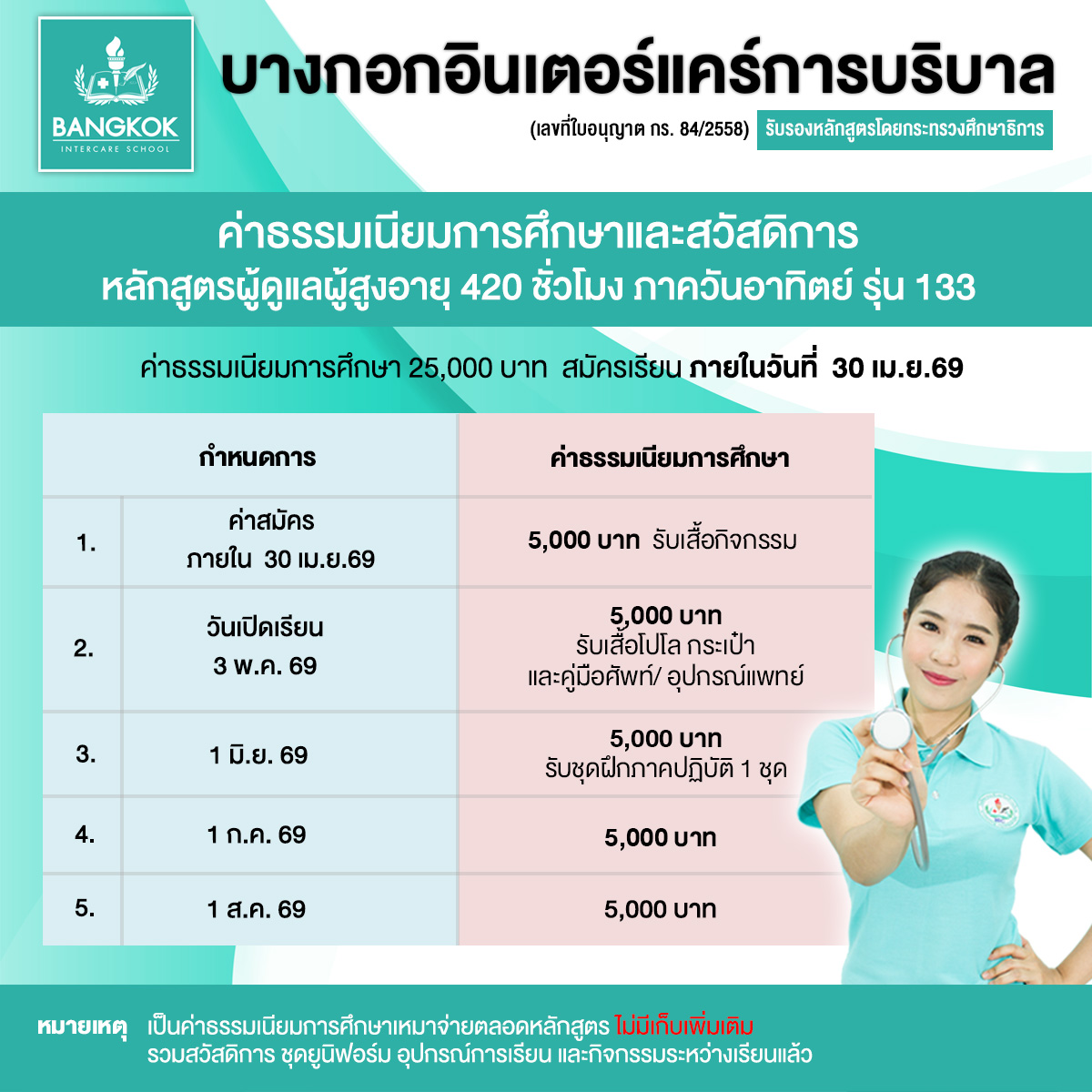 หลักสูตร ผู้ดูแลผู้สูงอายุ 420 ชั่วโมง ภาควันอาทิตย์ รุ่น 133 เริ่มเรียน 3 พ.ค. 69